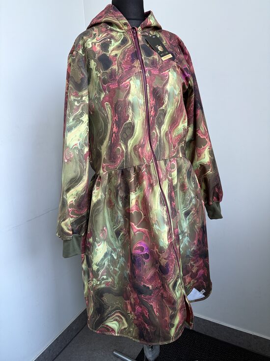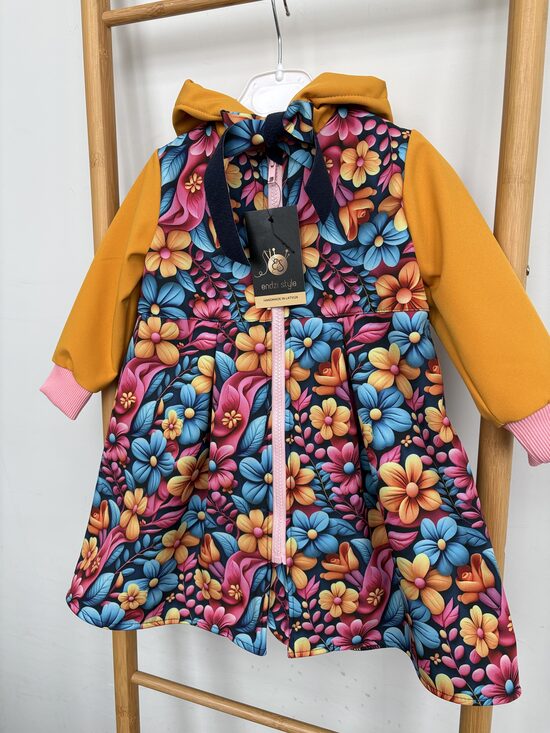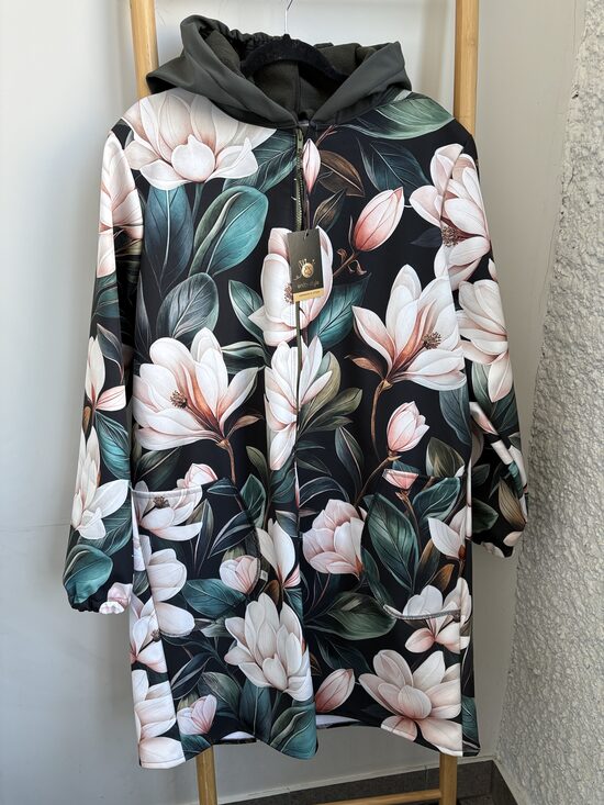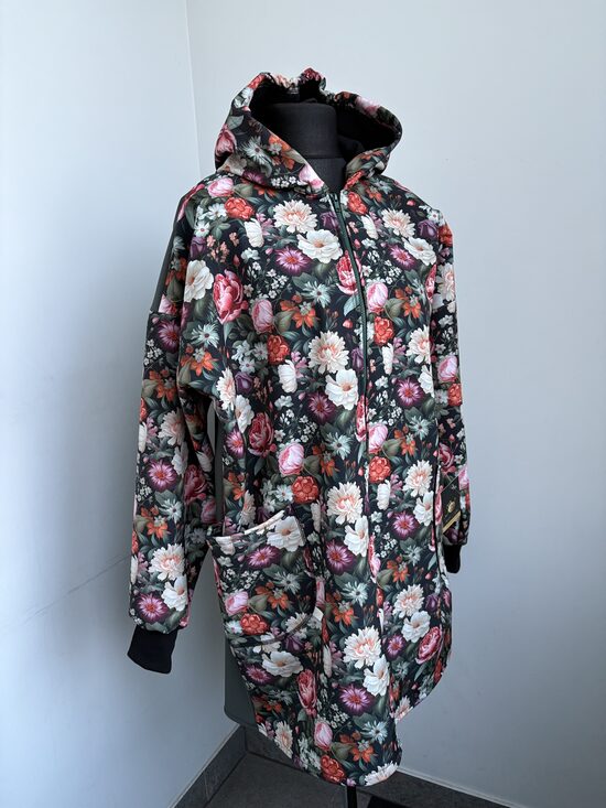 Puķains softshell mētelis ar kapuci. Peonijas.